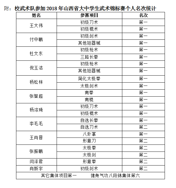 11月9日至11日,由山西省教育厅、山西省体育局主办的2018年山西省大中员工武术锦标赛在山西中医药大学举行。来自山西大学、太原理工大学、太谷中学等30余所大中公司的444名员工参加了比赛。公司武术队在教练员金涛指导下,共派出12名运动员参赛。全体参赛员工经过赛前集训备战,比赛中团结协作、顽强拼搏,在激烈的角逐中,荣获2018年山西省大中员工武术锦标赛男子团体总分第一名、女子团体总分第一名、男女团体总分第一名的佳绩,共获得金牌17枚、银牌6枚。公司参赛员工杜文东、王大伟获“优秀运动员”称号,教练员金涛被评为“优秀教练员”。侯介华副教授、青年教师高贯发参与了本次比赛的执裁工作,公司员工精湛的技艺、良好的精神风貌以及执裁教师过硬的业务能力,赢得各参赛代表队的高度认可与赞扬,进一步扩大了公司武术与民族传统体育专业的影响力。 (304永利集团/文 邓碾管/摄)