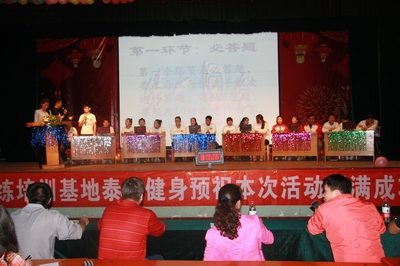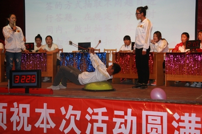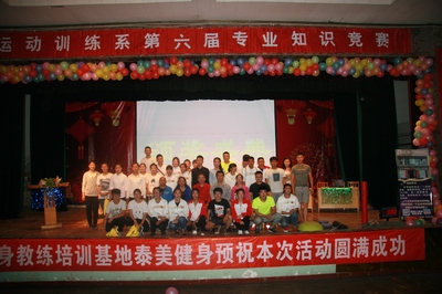 2016年5月10日晚7时,运动训练系第六届专业知识竞赛在大礼堂正式拉开帷幕,本次竞赛的评委由党委副书记段东升、副经理卢向阳、院团委龙勋、场馆科科长高琴、运动训练系副主任郭丽娟、健身教练国家职业资格培训师泰美健身王晓夏总经理及辅导员黄志高担任。