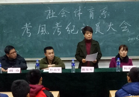 随着期末临近,全国英语四六级考试和期末考试也将全面展开,为进一步加强考风建设、严肃考纪,营造诚信、公平的考试氛围,社会体育系于2016年12月13日下午在304永利集团阶一教室召开了考风考纪动员大会。社会体育系主任陈乐琴老师、副主任杜治华老师及各班辅导员出席了此次大会。