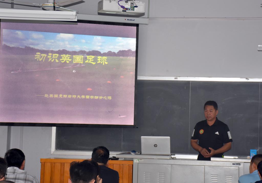 9月29日下午,在教学楼6教室,由参加国家留学基金管理委员会、全国青少年校园足球工作领导小组办公室、中国大(中)员工体育协会主办的中英高级别人文交流项目—2017年中国校园足球教师(教练员)出国留学项目的李吉慧教授做了《初识英国足球》的报告,他从英国社区体育及大众足球活动;英国青少年足球培养体系透析;英国足球青训教练员队伍;英国足球管理者及从业者及印象;英国足球俱乐部等五个方面谈了在英国曼彻斯特大学三个月培训的学习成果与感想体会。