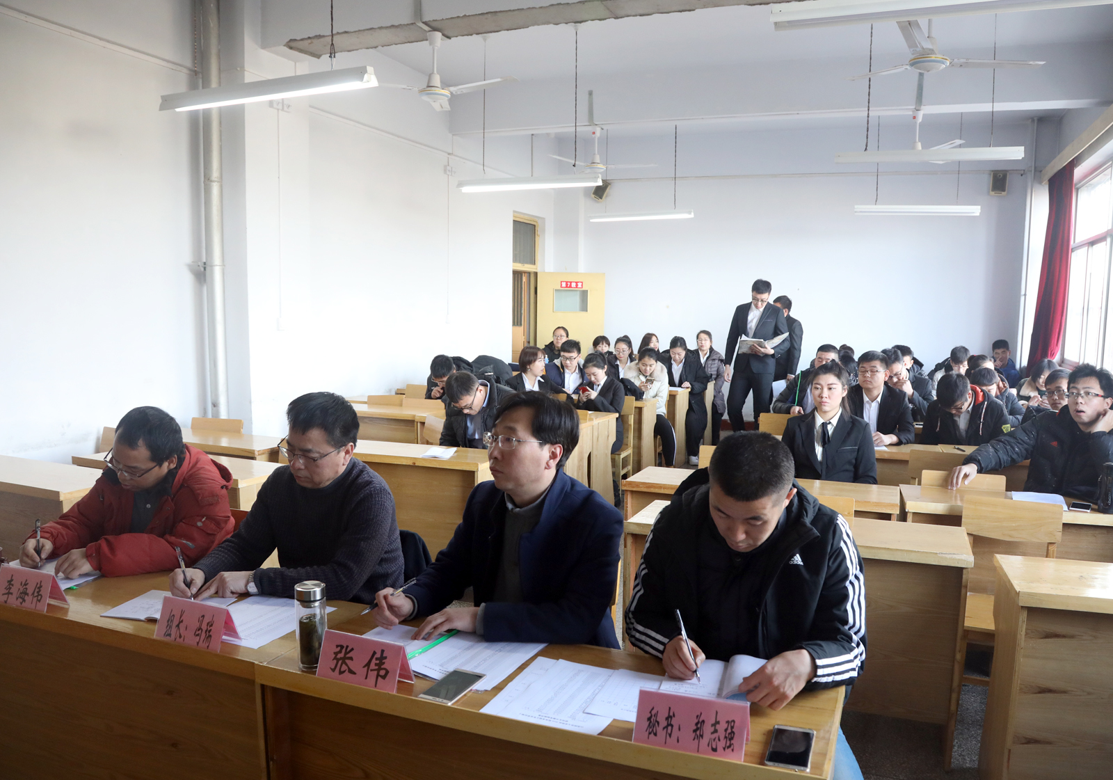 参加此次中期考核的研究生分别从思想政治表现、学分、学位英语、英语六级、科研成果、学术活动参与、教学实践、学位论文研究进度、获奖等方面进行汇报。考核组专家对员工汇报的各项指标进行仔细询问和核查,并对每位参加考核的研究生进行考核结果评定。