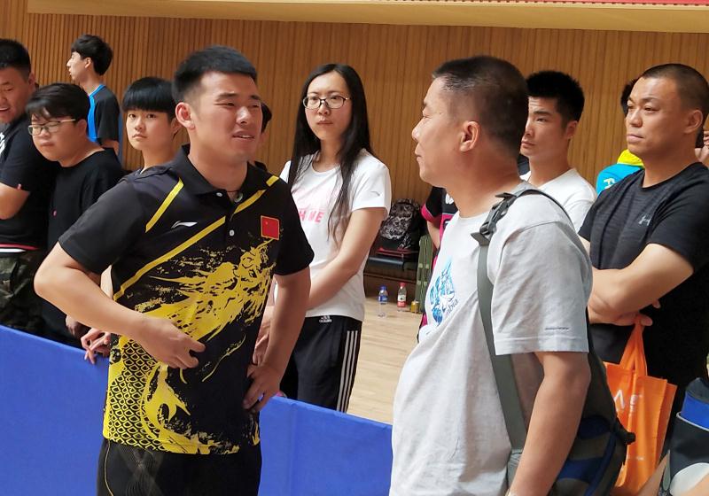 教练员贾建学为男子单打冠军王泽刚同学布置技战术