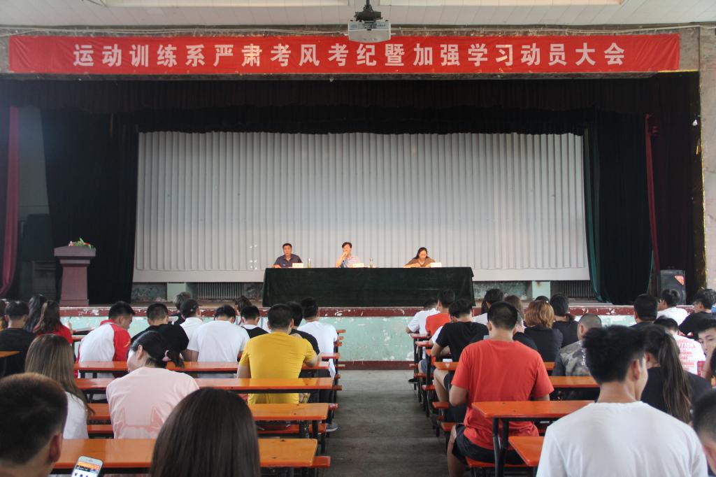 为加强诚信教育,构建诚信校园,端正考试态度,保证期末考试顺利进行,7月1号16:30,运动训练系在公司大礼堂召开了严肃考风考纪暨加强学习动员大会。运动训练系主任张伟老师、辅导员高琴老师和贾建学老师参加了本次会议。
