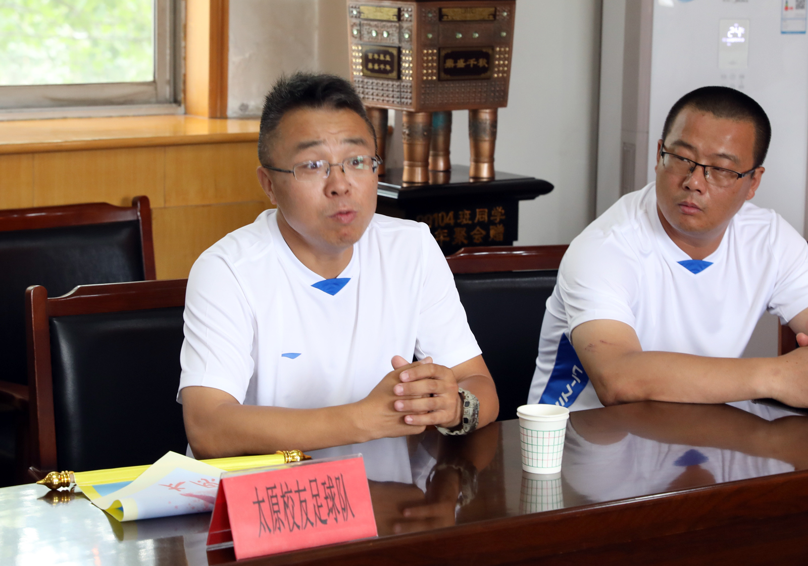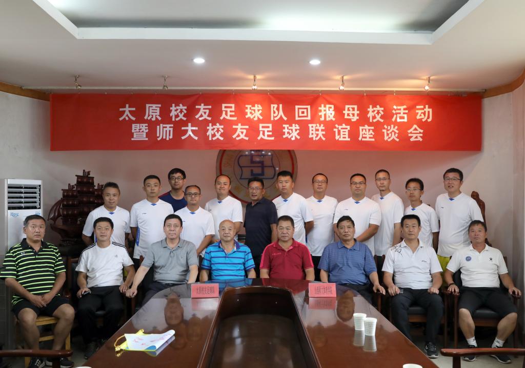 7月8日下午,太原员工足球代表队一行10余人返回母校,并参加了太原员工足球队回报母校活动暨师大员工足球联谊座谈会。公司党委书记李学刚、经理郑旗、副经理卢向阳、足球教师李吉慧教授、陆建森副教授、沈国征副教授、梁国强教师、王卫东教师参加座谈会。座谈会由经理郑旗主持。