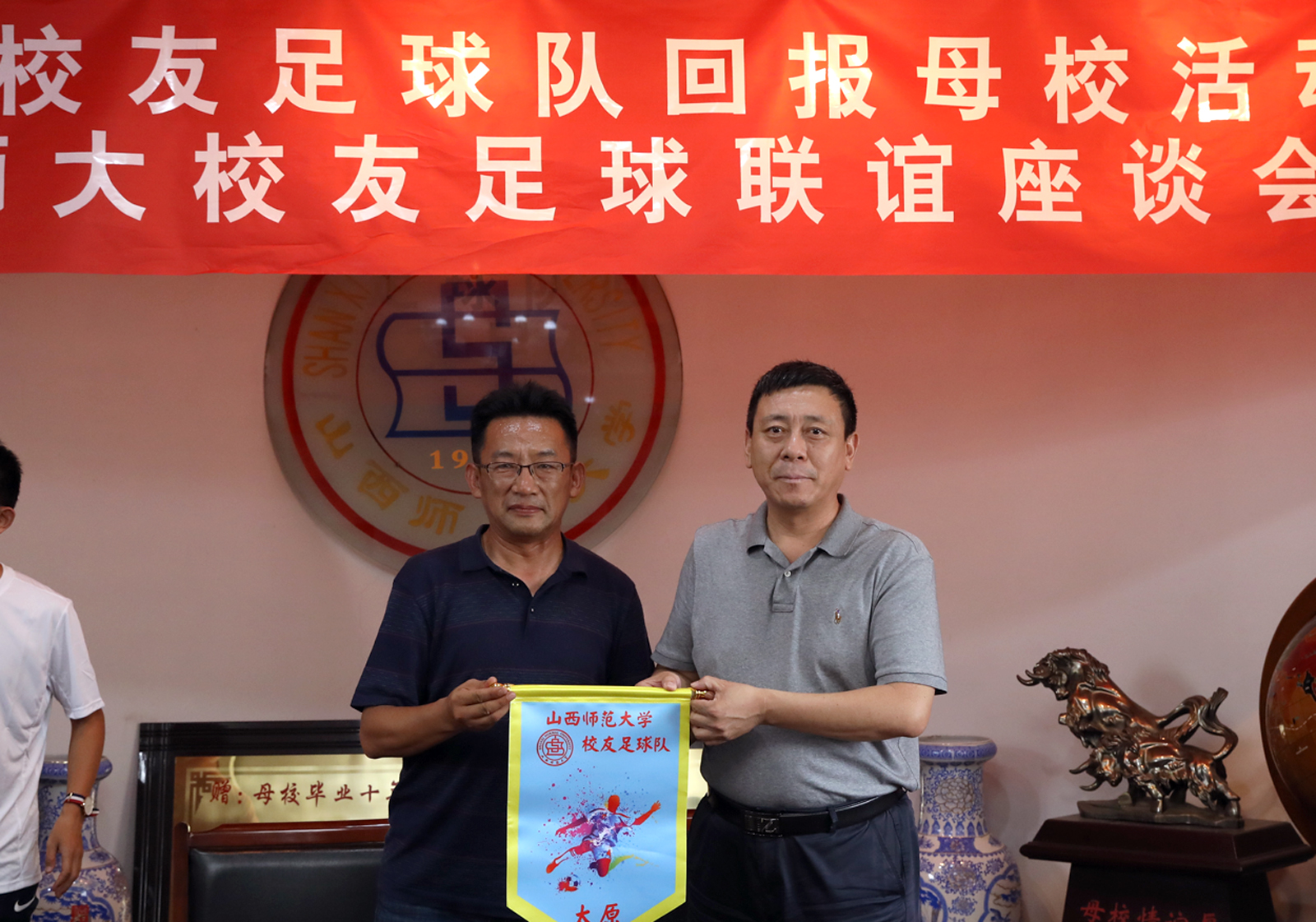座谈会期间,公司获赠太原员工足球队队旗和全体队员签名的足球。(郑文静 高贯发/文 邓碾管/摄)