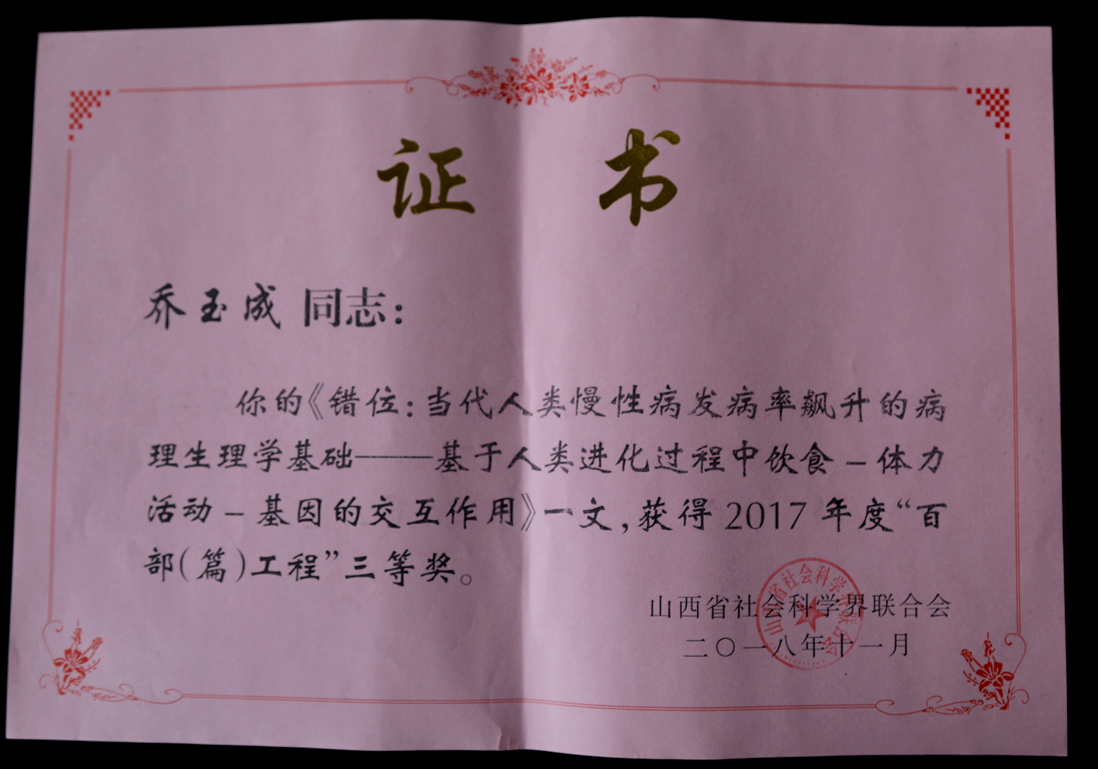 近日,山西省第十次社会科学研究优秀成果评奖结果公布,公司乔玉成教授(合作者:王卫军)的论文《全球人口体力活动不足的概况及特征》荣获山西省第十次社会科学研究优秀成果二等奖;据悉,乔玉成教授的论文《错位:当代人类慢性病发病率飙升的病理生理学基础——基于人类进化过程中饮食-体力活动-基因的交互作用》荣获2017年度“百部(篇)工程”获奖成果三等奖,为公司学科攻坚计划的实施作出了贡献。(科研与研究生教育办公室供稿)