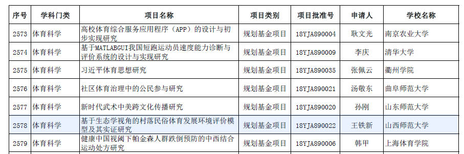 据教社科司函〔2018〕130号文件通知,公司王铁新副教授获2018年度教育部人文社会科学研究一般项目。项目名称,基于生态学视角的村落民俗体育发现环境评价模型及其实证研究,课题号:18YJA890022。