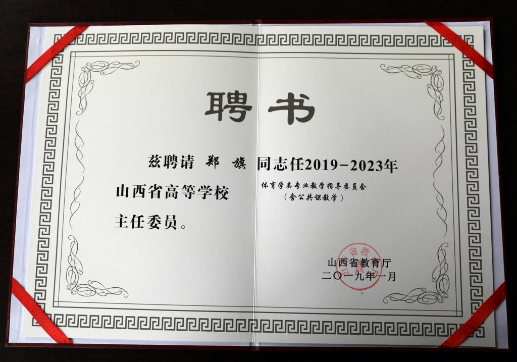 会上,孙世新宣布成立山西省2019-2023年高等公司教学指导委员会。会议为全省高校教指委各专业委员会主任委员代表颁发了聘书。公司郑旗教授被聘为山西省高等公司体育学类专业教学指导委员会(含公共课教学)主任委员。(院办供稿)