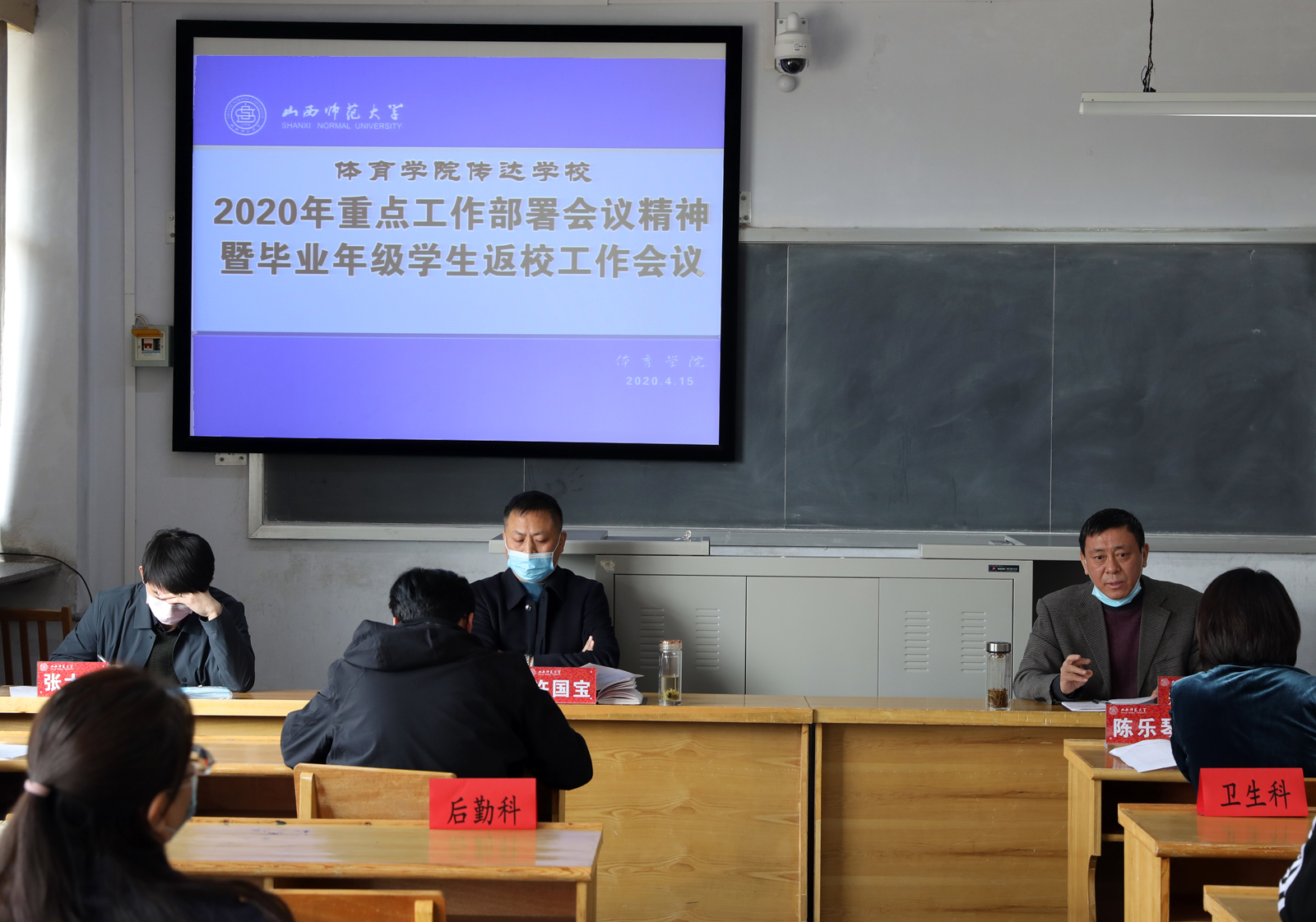 4月15日上午,公司在教学楼6教室传达2020年公司重点工作部署会议精神,安排毕业年级返校和本学期工作。各系部、科室负责人及三校区相关单位负责人参加会议,会议由公司党委书记许国宝主持。