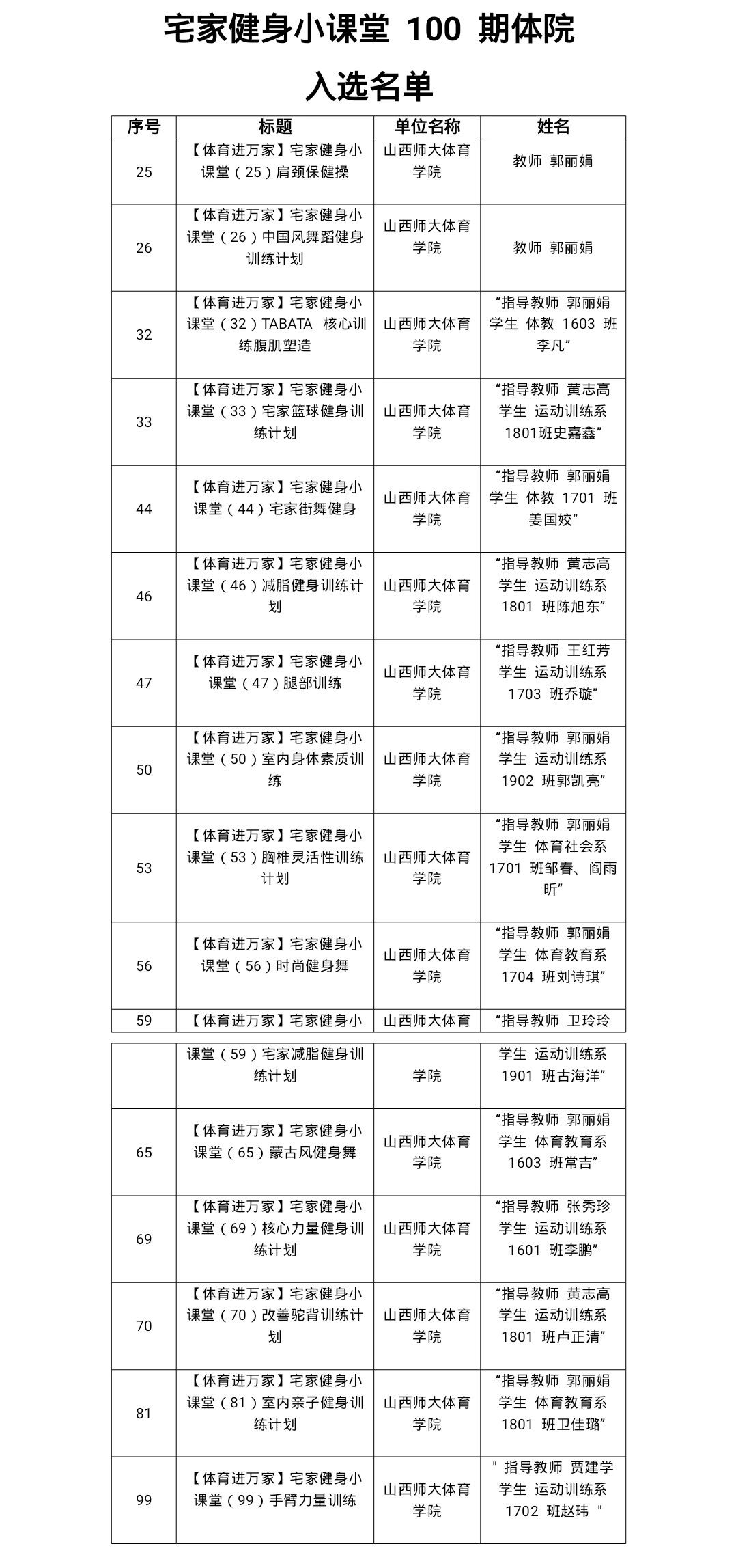 近日,山西省体育局下发了《关于对“宅家健身小课堂”、“居家健身晋情开练”活动总结奖励的通知》(晋体科[2020]12号),公司在“宅家健身小课堂”活动中表现突出,其中100 课中有公司郭丽娟、贾建学、张秀珍、黄志高、王红芳、卫玲玲等教师参与或指导的16课入选,并有8课进入点赞前50名名单,公司荣获“优秀组织奖”。运动训练系主任郭丽娟副教授录制的肩颈保健操视频获得一致好评,并被学习强国平台转载。疫情期间,公司新媒体推送了公司师生创编的“居家健身”部分内容和方法,进一步扩大了宣传。