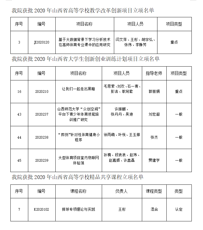 近日,山西省教育厅发布《关于公布2020年山西省教学质量提升工程各类项目立项名单的通知》,公布2020年山西省教学质量提升工程各类项目立项名单。公司各类项目共获批立项6项。其中获批教学改革创新重点项目1项,老员工创新创业训练计划项目4项(重点1项,一般3项),精品共享课程认定类1门。