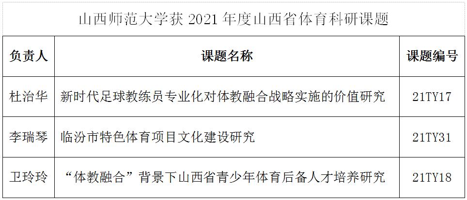 2021年6月23日山西省体育局下达了关于2021年度山西体育科研课题立项的通知,公司杜治华、李瑞琴和卫玲玲老师获2021年度山西体育科研课题立项资助。获立项课题的信息如下:(院研究生部供稿)