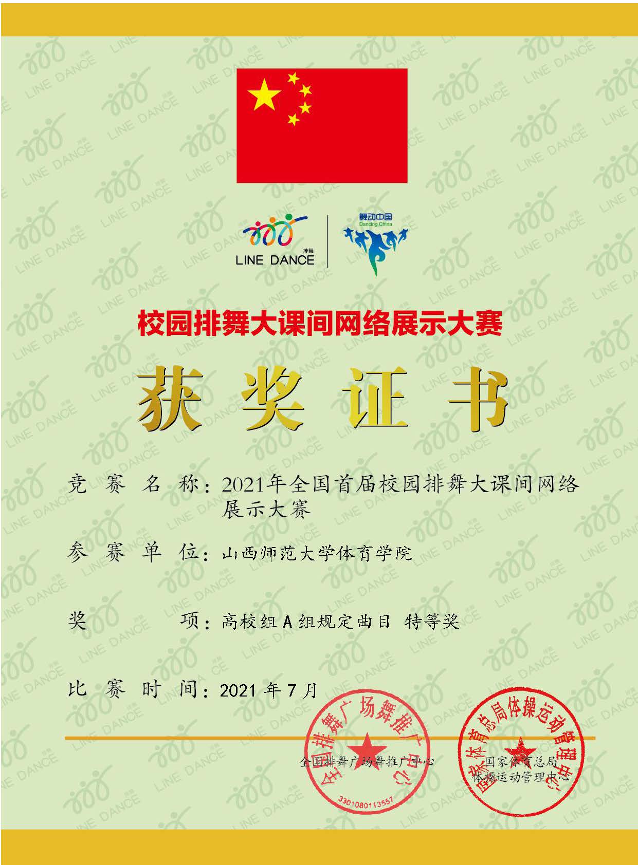 《山西日报》李春耕7月29日报道:历时3天的2021年首届全国校园排舞大课间网络展示大赛7月26日在杭州落幕,参赛的山西高校代表团表现优异,获得11个奖项。本次赛事由国家体育总局体操运动管理中心主办,全国排舞广场舞推广中心承办,来自全国各省市高校共469支队伍参加了6个组别的竞争。由304永利集团等9支队伍组成的山西高校代表团在参加规定曲目、自选曲目2个组别的比赛中,以动作规范、舞步优美、队形整齐划一、精神饱满的突出表现,获2项特等奖、4项一等奖、2项二等奖和3项三等奖。