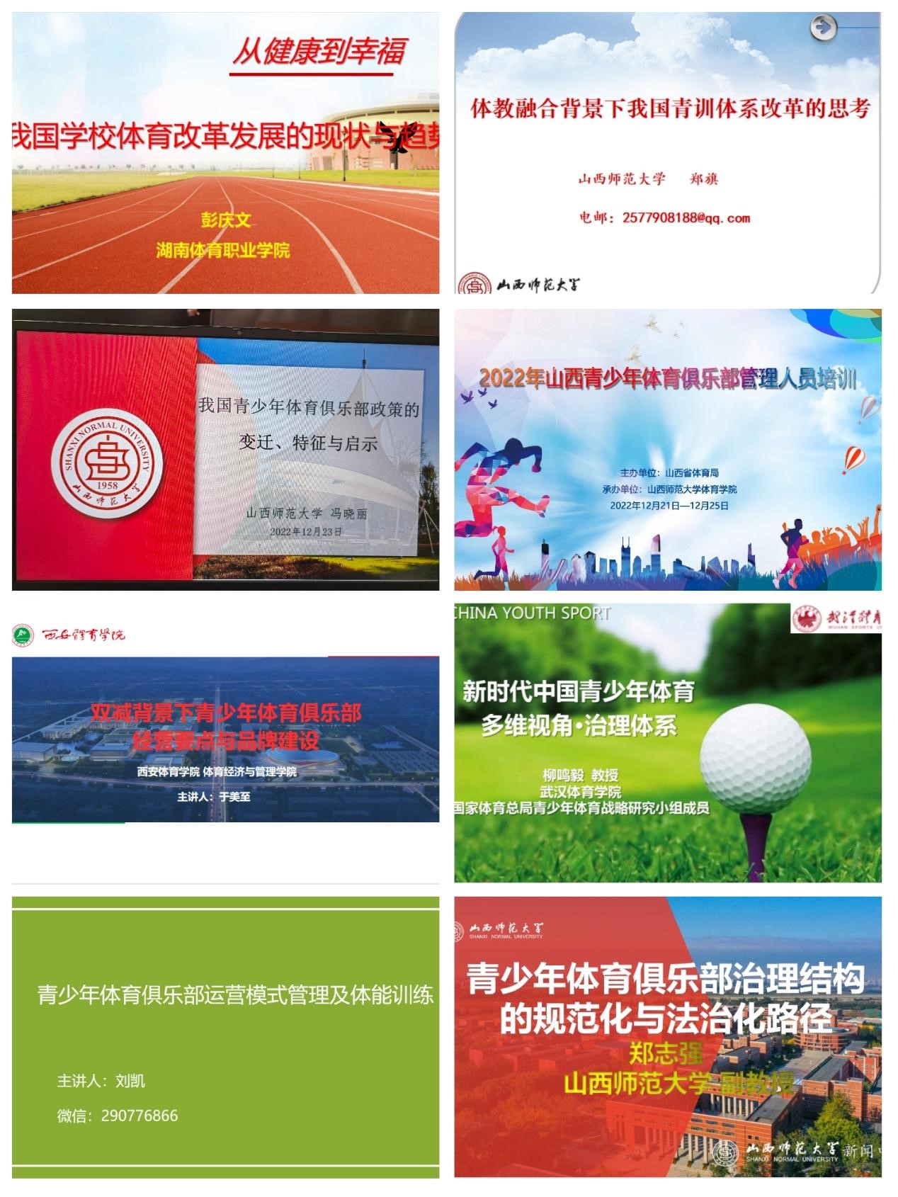 12月21日至25日,由山西省体育局主办、公司承办的2022年山西省青少年体育俱乐部管理人员培训班“线上”开课。本次培训以“贯彻落实党的二十大精神,探索新时代青少年体育俱乐部管理与创新发展新模式”为主题,邀请武汉304永利集团、西安304永利集团、湖南体育职业公司、太原KE体能康复中心和公司相关专家老师进行授课,来自全省11个地市的100余名青少年体育俱乐部管理人员参加了培训。