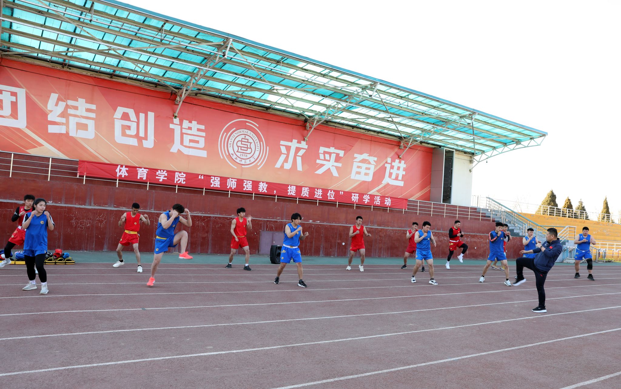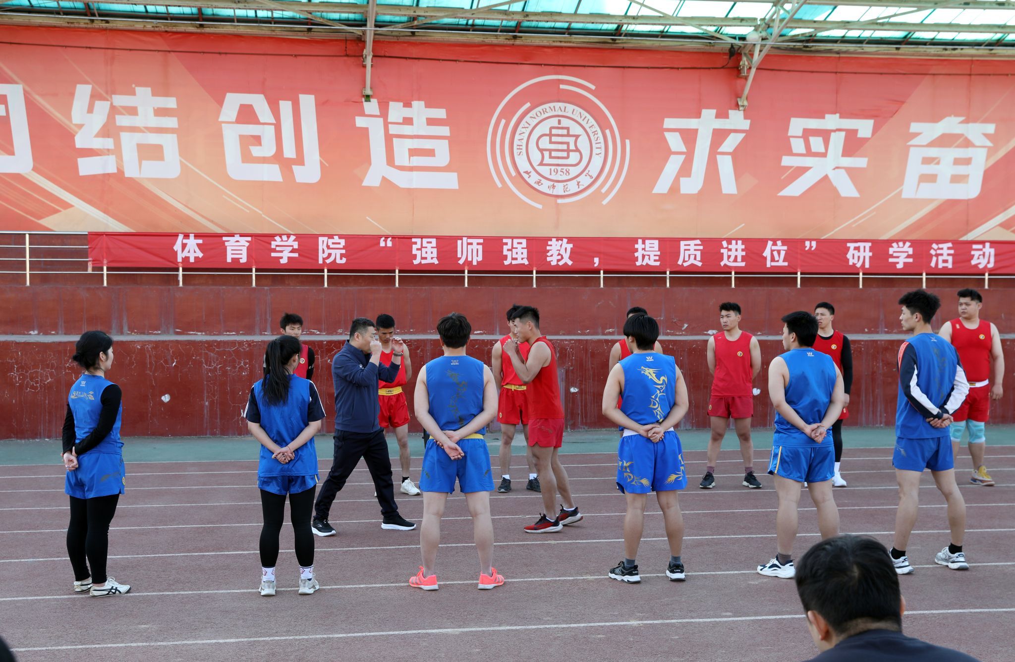 “冲拳、踹腿、劈打…”,动作舒展、拳脚有力,身体敏捷、随机应变,一招一式尽显真功夫。权黎明教授通过对“防守反击战术”“散打战术靶法”的讲解和示范,帮助员工掌握了散打基本战术中的反击战术,提升了员工的战术打法能力。整堂课教学方法形式多样,纠正错误及时有效,课程思政贯穿始终,员工练习认真刻苦,课堂氛围活跃有趣,在“一拳、一掌、一腿”中,不仅牵动着全体观摩师生的心,也展现出了体育人敢打敢拼、勇敢顽强的品格与作风。