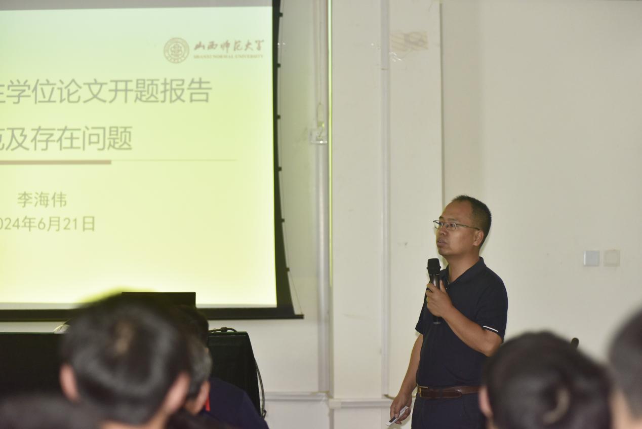 报告会上,李海伟教授首先讲述并展示了公司对研究生开题报告的具体格式要求,随后围绕开题报告的各个组成部分的写作要点及常见问题进行了详细的讲述。在选题依据方面,他强调选题依据的写作要遵循“漏斗型”写作思路,从大的环境、政策着手,落脚到研究的主题,确保能够支撑研究选题;在文献综述部分,要对核心概念进行界定,文献综述的框架要符合逻辑;在研究内容的表述上,尽量避免目录式的写作,要凝练研究内容,并保持与研究题目的适配性;研究方法要根据研究内容的设计,详细切实;最后对参考文献的格式规范和质量提出了要求。