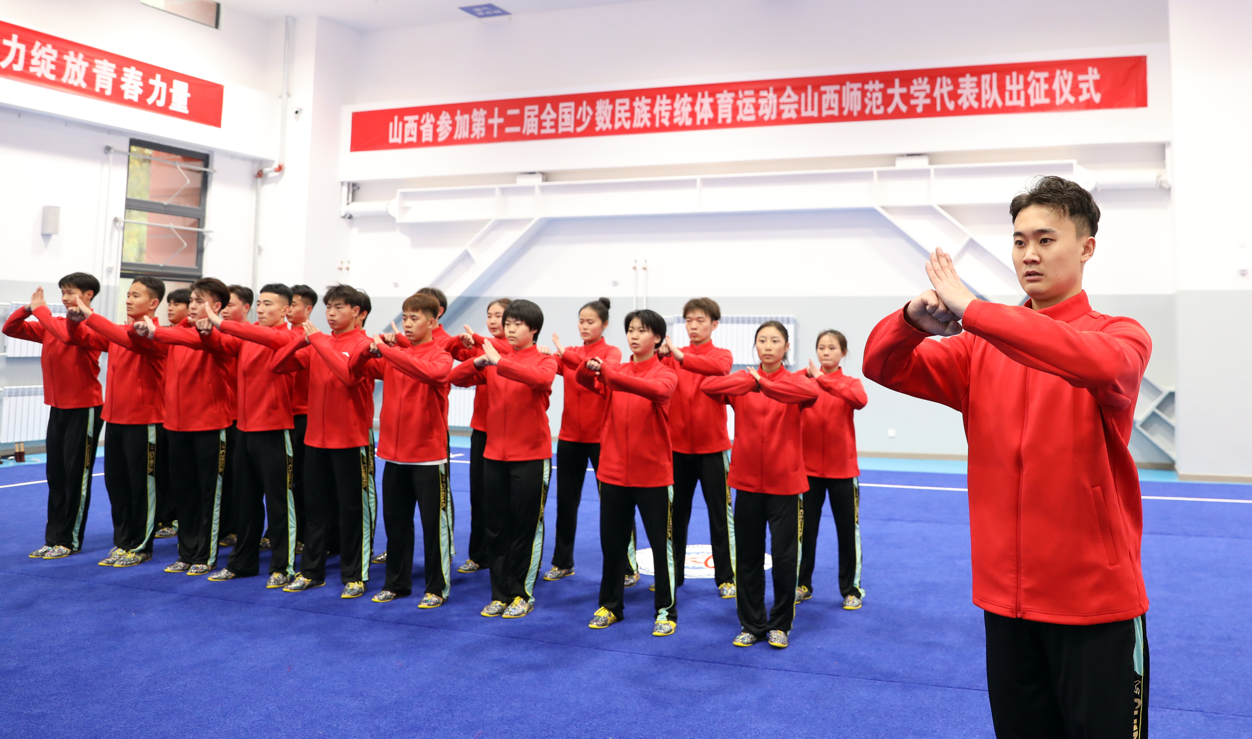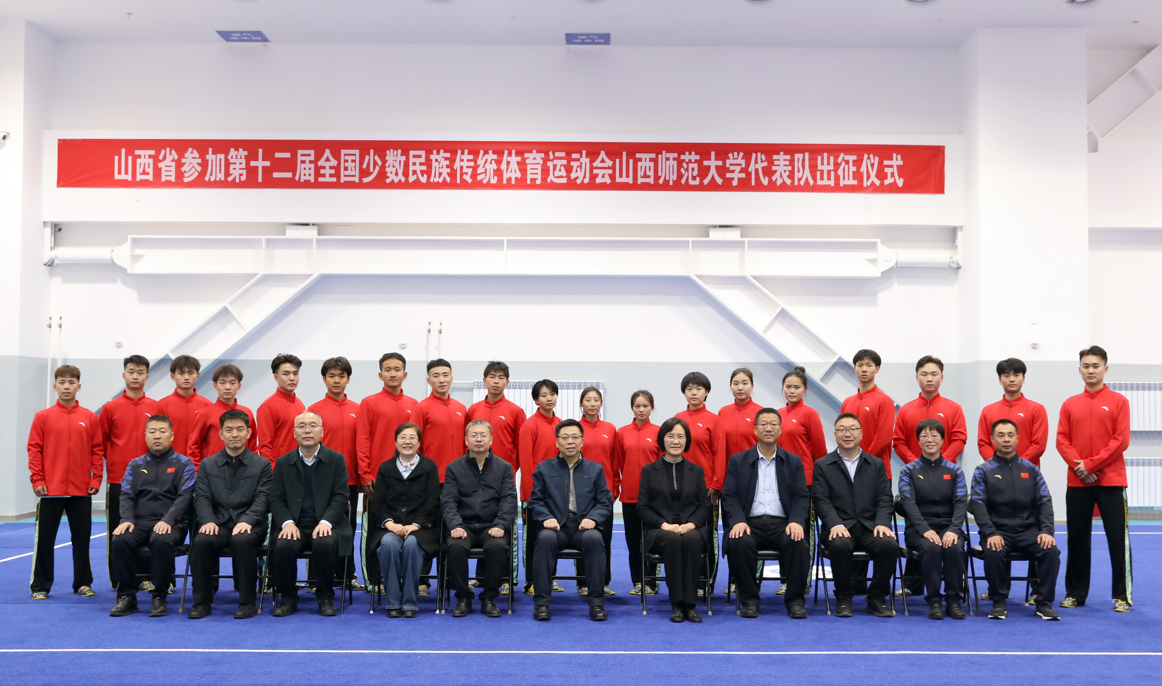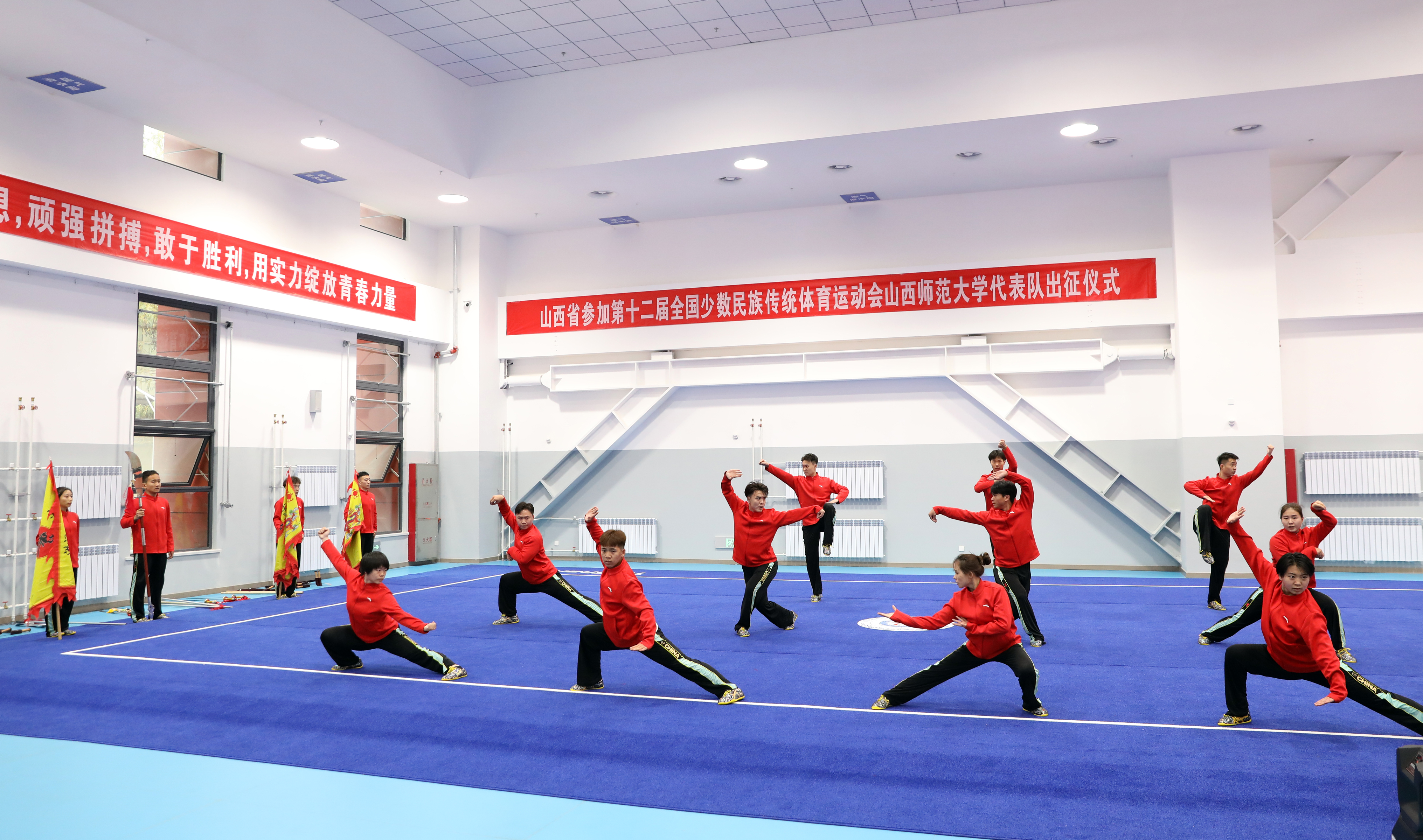 11月15日上午,第十二届全国少数民族传统体育运动会304永利集团代表队出征仪式在体育实训楼武术馆举行。公司党委书记殷杰宣布第十二届全国少数民族传统体育运动会304永利集团代表队出征,董事长许小红作了动员讲话,副董事长白文宏主持出征仪式。