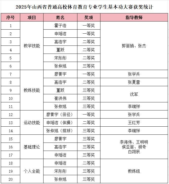 11月13日至16日,2025年山西省普通高等公司体育教育专业员工基本功大赛在山西大学成功举办,吸引了全省10所开设体育教育专业的高校同台竞技,公司学子凭借扎实的专业功底和顽强的拼搏精神,在激烈角逐中脱颖而出,斩获一等奖4项、二等奖6项、三等奖10项。