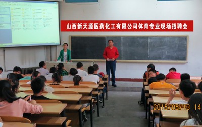 2015年5月13日下午,山西新天源医药化工有限公司在公司阶三教室举办2015届毕业生体育专业现场招聘会。出席本次招聘活动的有公司党委副书记段东升老师和毕业班辅导员老师,山西新天源医药化工有限公司办公室樊爱华主任和人力资源部的二位领导。