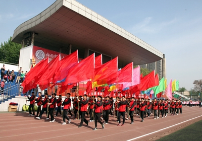 伴随着《运动员进行曲》,国旗班、彩旗方队、各系团体操方队、裁判员方队和各班辅导员带领的46个班级组成的运动员代表队,踏着整齐的步伐进入运动场,他们英姿飒爽,意气风发,代表了体院学子对运动会的关注与热情。在庄严的国歌声中,全体师生肃立,向国旗行注目礼!