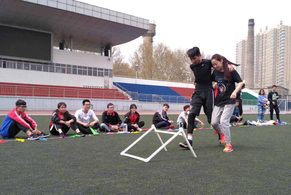 两人三足比赛于4月7日在田径场举行,参赛规则为每个代表队由8组组成,设障碍物,以接力的形式进行比赛。参赛同学们一个个相互挽着肩,脸上闪着坚定的神情,随着哨声响起,队友们相互扶着喊着“一二,一二”向终点冲去。