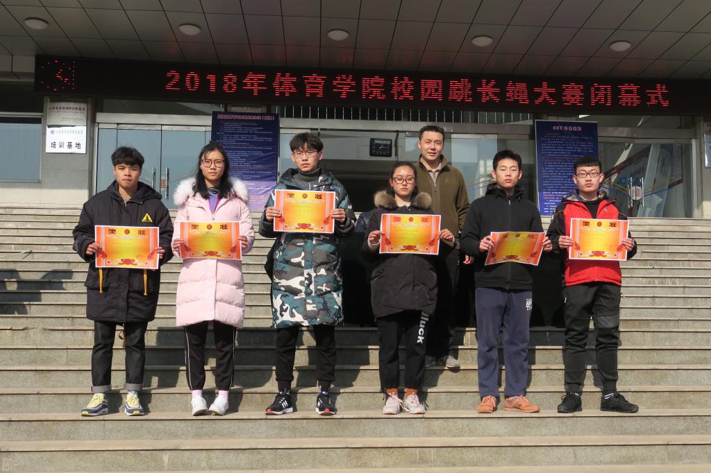 2018年校园跳长绳大赛自12月4日开赛,各参赛班级代表队以饱满的热情积极参加,绳子被同学们抡得呼呼生风,打得地面叭叭直响,同学们穿梭其间,动作敏捷;各队伍队员之间相互鼓励,协调配合,全身心地投入比赛,跳出了各自最好的成绩,激发了运动员的无限潜能。39支队伍460余名运动员经过一周激烈的角逐,最终体教1803班、文理1803班、社体1601班分别荣获团体冠军、亚军、季军;社体1801班、文理1703班、社团联合会、体育教育系员工会荣获优秀组织奖;文理1601班、体教1605班运训员工会、民体员工会获得道德风尚奖。董冬冬、魏朋通、张丹丹等同学获得优秀运动员称号,王漫、王佳琪、高雅政等获得优秀裁判员称号。大赛裁判长杜治华老师宣读了比赛成绩和获奖名单,随后出席闭幕式的老师为获奖的集体和个人颁奖并合影留念。