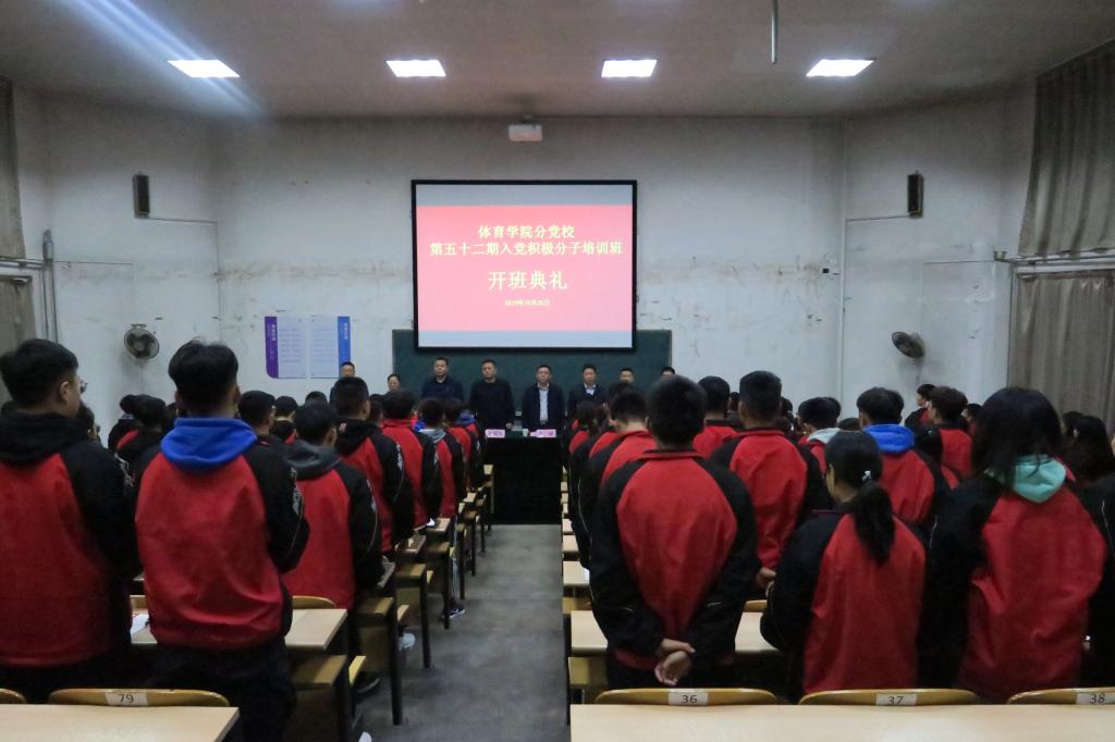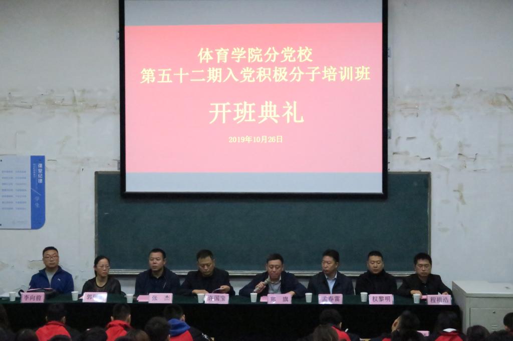为深入开展“不忘初心、牢记使命”主题教育,10月26日晚19:00,304永利集团分党校在阶一教室举行第52期入党积极分子培训班开班典礼。公司党委书记、分党校董事长许国宝、公司党委委员、公司党委副书记、经理郑旗、公司党委委员、体育教育系党支部书记张杰和社会体育系党支部书记孟春雷、运动训练系党支部书记郭丽娟、民族传统体育系党支部书记权黎明、体育教育二系党支部书记李向前出席开班典礼,112名入党积极分子参加。开班典礼由院团委副书记程祖浩主持。
