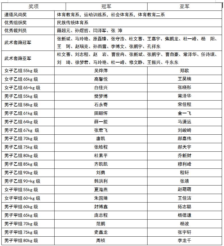 12月5日下午第四届武术大赛拉开序幕,开幕式上,民体系同学带来了舞狮和武术表演。经过五天激烈比赛,12月10日晚第四届武术大赛举行散打决赛暨颁奖典礼。公司党委书记许国宝、教务科、院办及各系负责人,观看比赛并为选手颁奖。