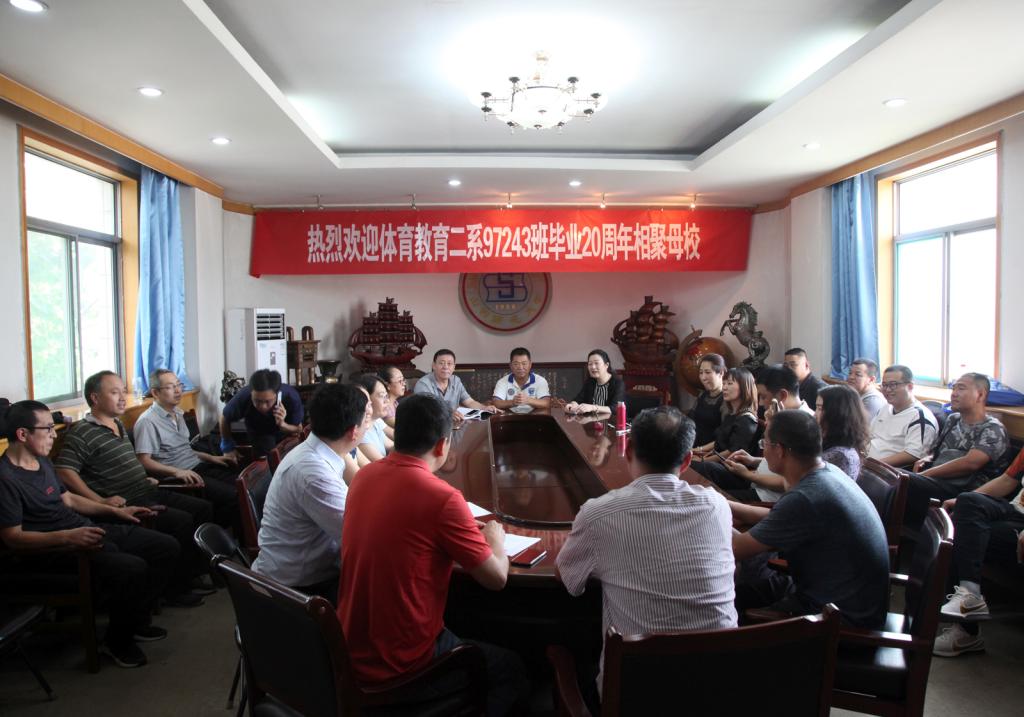 经理郑旗对各位员工毕业20年重返母校表示热烈的欢迎,他向员工简介了公司六十年的发展、专业与团队建设和人才培养、竞赛训练及新校区建设的进展,并对各位员工20年取得的成绩表示由衷的敬意!李吉慧和焦绿青老师对各位员工在工作岗位上取得的成绩给予充分的肯定,希望员工们更多的关注母校的发展。辅导员吴合斌勉励同学们热爱自己的职业,常回母校看看!同学们深情地回顾了20年来个人发展,纷纷表示,感恩师大体院和老师对自己的培养,今后将继续传承“体院人”的精神,为母校的发展壮大尽员工的绵薄之力。