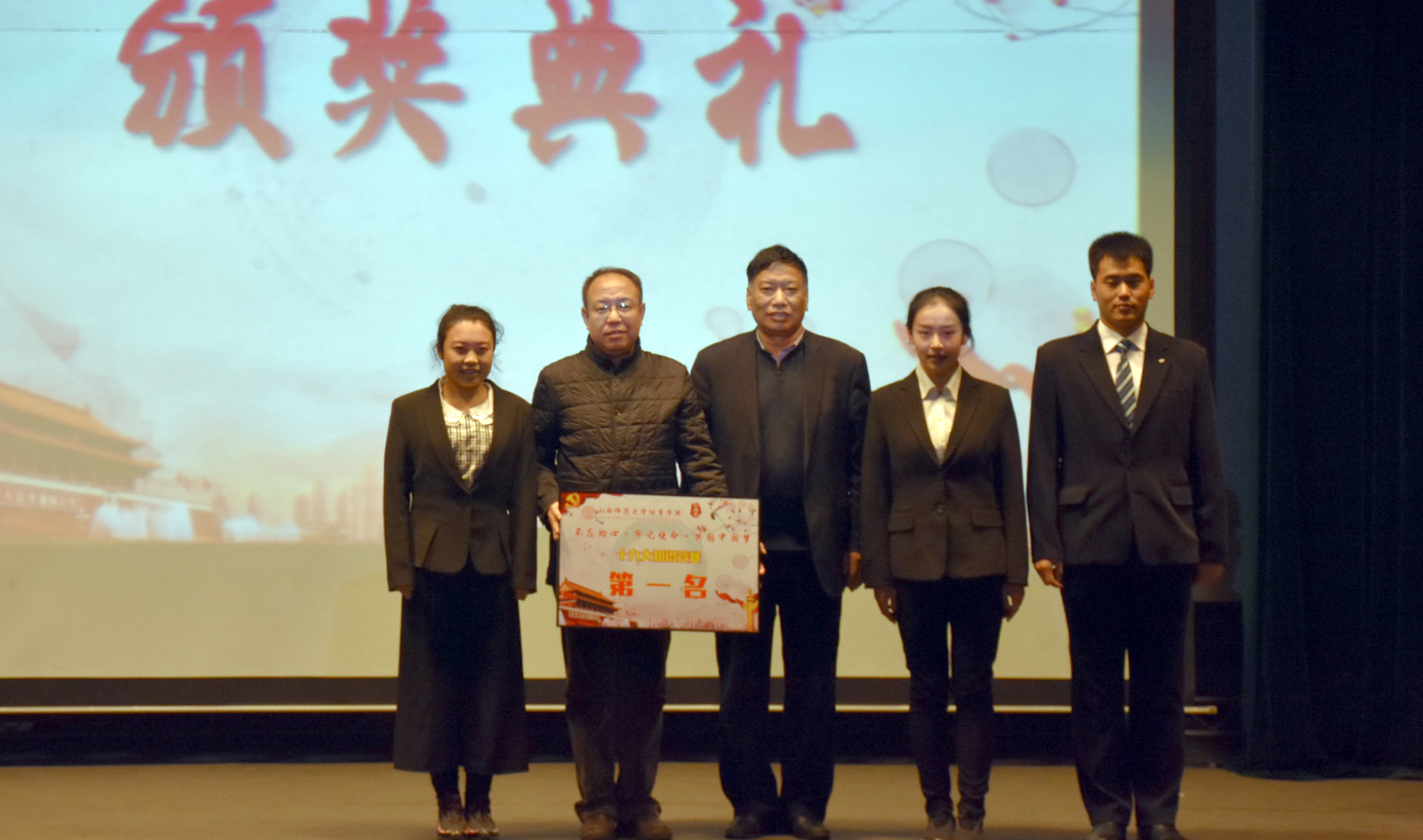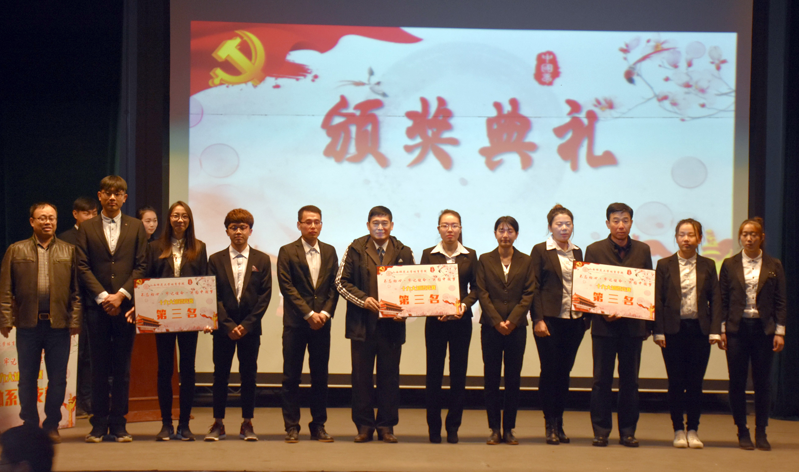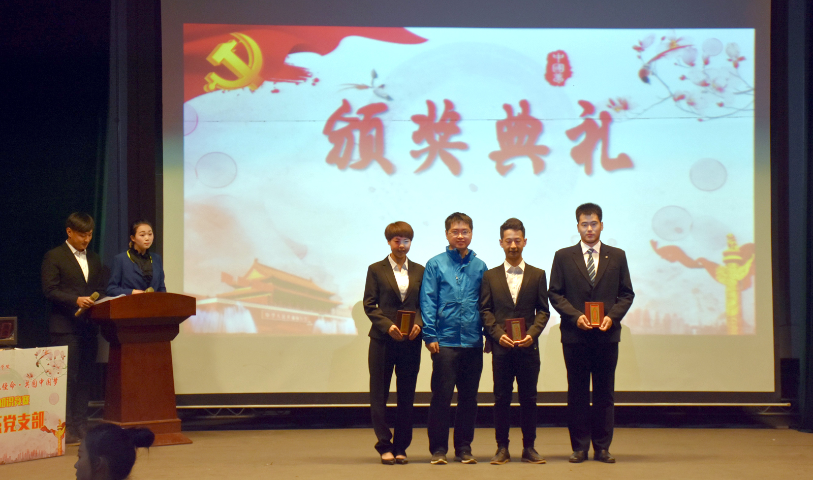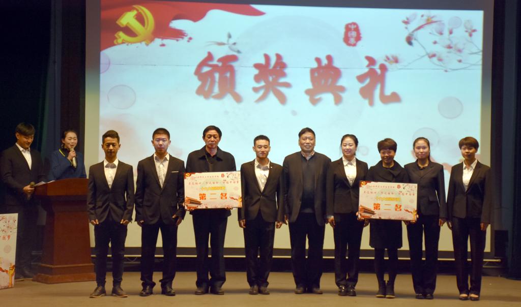 竞赛现场精彩纷呈,高潮迭起,其内容涵盖了十九大、新党章党规党纪相关知识,设置了党支部书记答题、必答题、抢答题、争分夺秒、风险题五个环节,每个环节规则各异,既考验参赛选手掌握党章党规党纪知识的全面性、系统性,也能够将选手综合运用党章党规党纪知识分析问题的能力和临场表现力展现得淋漓尽致。首先由各系党支部书记答题,每一位书记都可以快速回答正确答案,展现了他们丰富的知识积累和敏捷的思辨能力。之后,各代表队参赛选手使出浑身解数,沉着应对,密切配合,在必答题环节精准,抢答题环节激烈,风险题环节谨慎,过关斩将,你追我赶,以饱满的精神状态,积极踊跃回答着每一道竞赛题,气氛活跃而紧张,上演了一场精彩纷呈的党建文化盛宴。在工作人员统计分数的时间内,主持人与现场观众进行了互动环节,大家积极参与抢答,工作人员将新党章作为礼品赠送给他们。最后院领导老师为获奖单位及优秀个人颁发了奖状,并进行了合影留念。