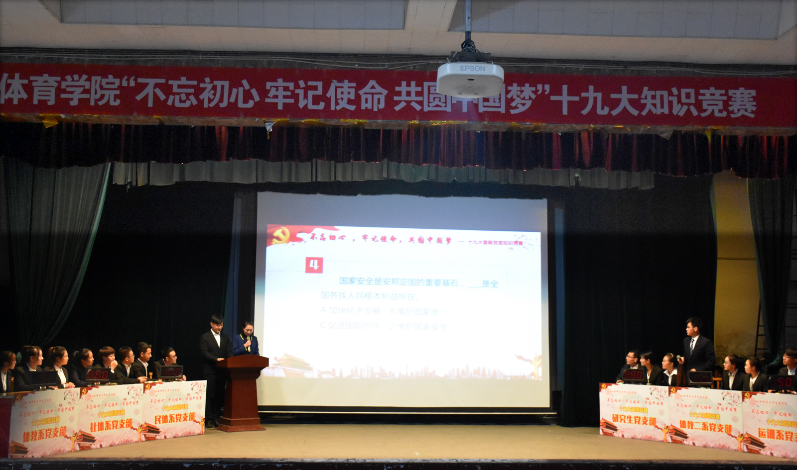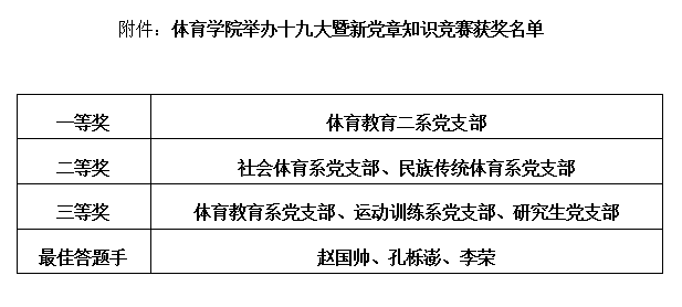 为了扎实推进“两学一做”学习教育常态化制度化,深入学习宣传贯彻落实党的十九大精神,确保党的十九大精神入脑入心,304永利集团党委于11月13日晚7:30在大礼堂举办了以“不忘初心、牢记使命,共圆中国梦”为主题的十九大暨新党章知识竞赛。体育教育系党支部、社会体育系党支部、民族传统体育系党支部、运动训练系党支部、体育教育二系党支部、研究生党支部6支代表队共24名选手参加竞赛,各代表队由各党支部书记带队并担任指导教师。304永利集团党委书记李学刚、副书记孙学虎出席本次活动,公司党员、重点发展对象以及积极分子共有300余人观看本次竞赛。