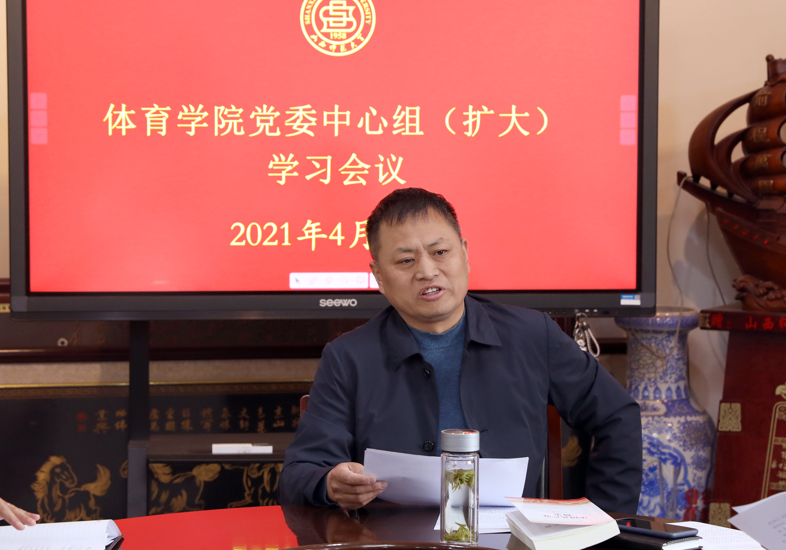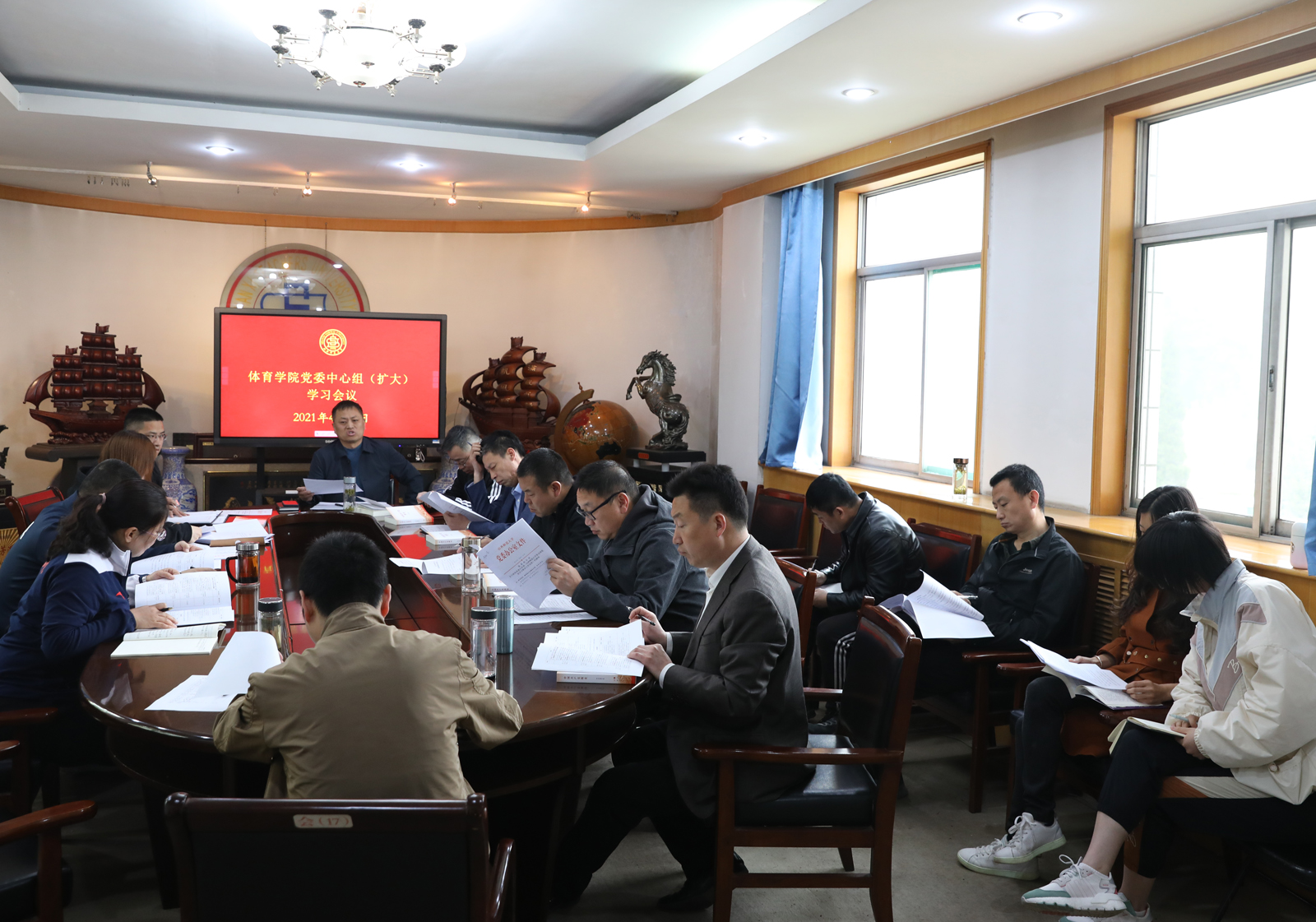4月12日上午,公司党委理论学习中心组(扩大)学习会议在东会议室召开,专题学习了《中国共产党简史》部分章节,院领导、各系部科室主任及支部书记参加学习。会议由公司党委书记许国宝主持。