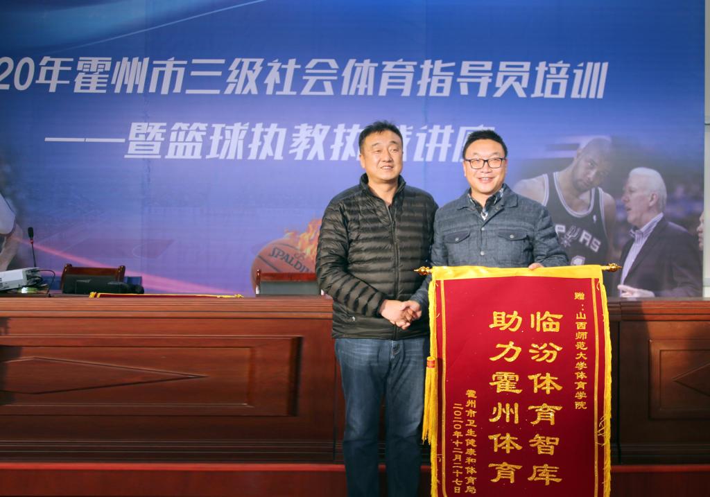 12月27日,李向前博士、李俊明副教授受临汾市体育局和临汾体育智库委托赴霍州市参加该市篮球教练员、社会体育指导员培训工作。李向前博士对霍州市篮球协会成员进行了现代篮球教练员职业素养、执教理念、教练员临场指挥等基本内容的传授;李俊明副教授从社会体育指导员服务宗旨、管理办法以及体育俱乐部经营与管理等方面,结合霍州体育工作实际进行了讲解。他们的讲授得到霍州市体育工作人员、教练员的一致好评,并向公司和临汾体育智库赠送旌旗,期待更多的专家教师服务基层。(院办)
