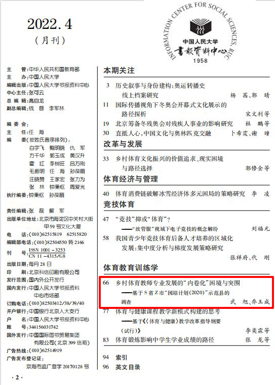 近日,武旭、乔玉成(通讯作者)发表在《体育学研究》2021年第6期的论文《乡村体育教师专业化发展的“内卷化”困境与突围——基于S省Z市“国培计划(2020)”示范县的调查》被中国人民大学书报资料中心《体育》(月刊)2022年第4期全文复印转载。该文主要探究了乡村体育专业化发展发展的成因和对策,认为城乡环境差异、身份认同危机、职业吸引力低下和内生动力不足是其主要原因,并从加强乡村公司硬件和软件环境建设、强化身份认同、唤醒发展意识和激发内生动力等方面破解乡村体育教师专业发展陷入“内卷化”困境的策略。
