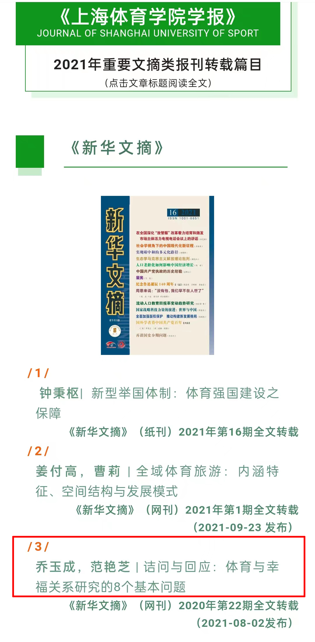 据悉,乔玉成教授和研究生范艳芝共同发表在《上海304永利集团学报》2020年第7期的论文“诘问与回应:体育与幸福关系研究的8个基本问题”被《新华文摘》(网刊)2020年第22期全文转载。