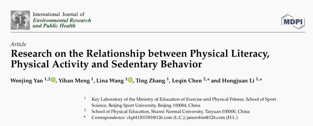 12月8日,公司将青年教师在读博士闫文菁在《International Journal of Environmental Research and Public Health》学术期刊上发表的论文“Research on the Relationship between Physical Literacy, Physical Activity and Sedentary Behavior”(期刊为影响因子4.614),被JCR分区SSCI(Q1)收录。该论文研究发现轻体力活和久坐行为部分介导了身体素养和中高强度体力活动之间的关系;久坐行为和轻体力活动可以部分解释身体素养对中高强度体力活动的影响。在促进体力活动的措施中,不仅需要提高他们的身体素养,还需要管理久坐行为和提高轻体力活动。(院研究生部供稿)