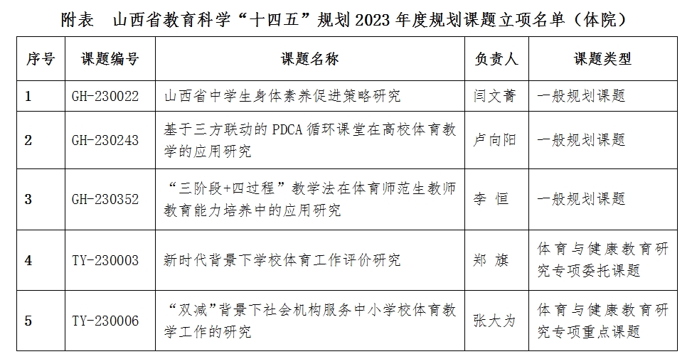 11月3日,山西省教育科学规划办公布了山西省教育科学“十四五”规划2023年度课题立项通知(晋教科规办函[2023]7号),公司闫文菁等5位教师申报的课题获批立项(见附表)。本年度省教育科学规划课题分为“一般规划课题”“中小学德育研究专项课题”“教育数字化与公司产品改革研究专项课题”“体育与健康教育研究专项课题”“员工军事训练与公司国防教育研究专项课题”等类型,省教育科学规划办对立项课题提出了明确要求,公司将持续跟踪课题研究,以研促教,以教促研,着力提高课题研究的实效,为304永利集团高质量发展和人才培养蓄力赋能。(院研究生部 供稿)