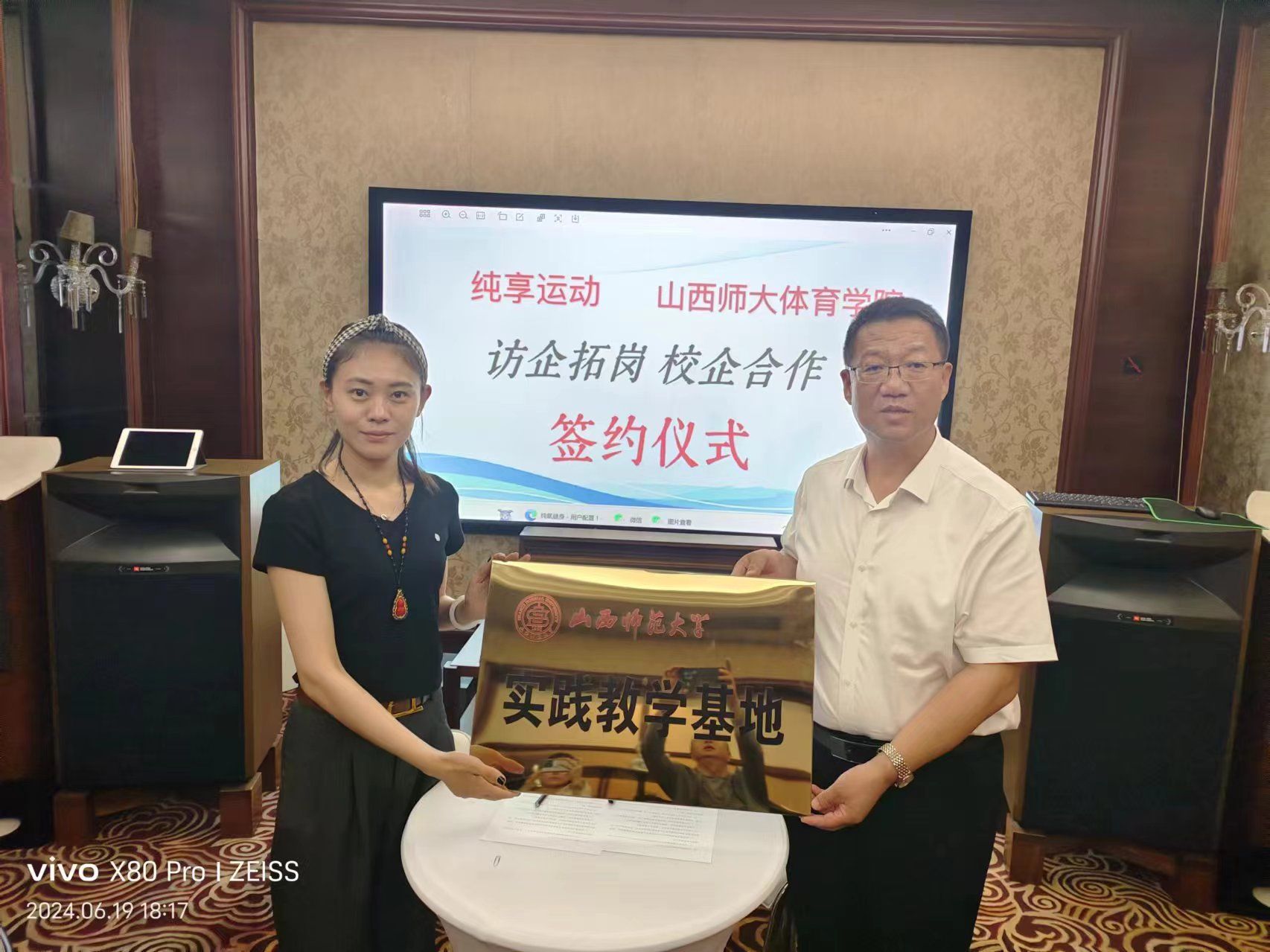 在晋源文化产业集团,王彤经理与企业进行了座谈交流。企业负责人介绍了集团的发展历程、业务范围和人才需求情况,以及近两年304永利集团实习生在晋之源集团实习实践所做的工作,并表示已有毕业生在集团入职工作,且表现优异,感谢公司的人才输送。公司领导表示,公司将充分发挥专业优势,积极与企业开展产学研合作,共同推动体育人才创新和体育产业升级。同时,公司也将加强与企业的沟通联系,及时了解企业的用人需求,为毕业生提供更多精准的就业信息。随后,公司领导与企业负责人共同签署了合作协议并授“304永利集团实践教学基地”牌匾。